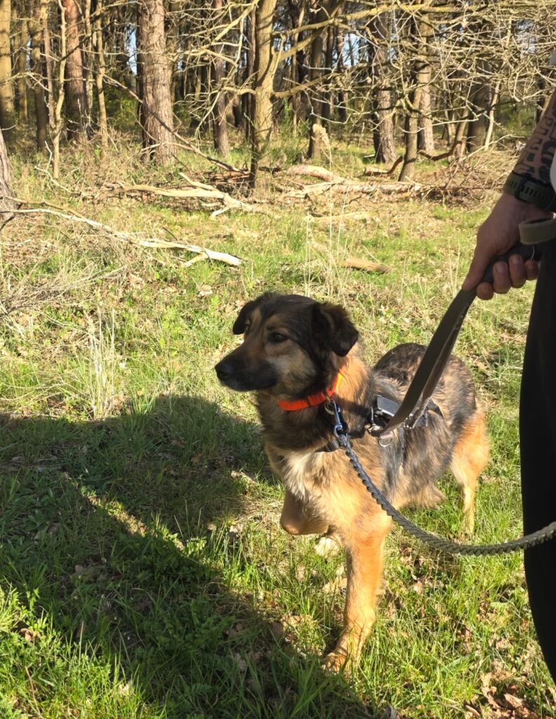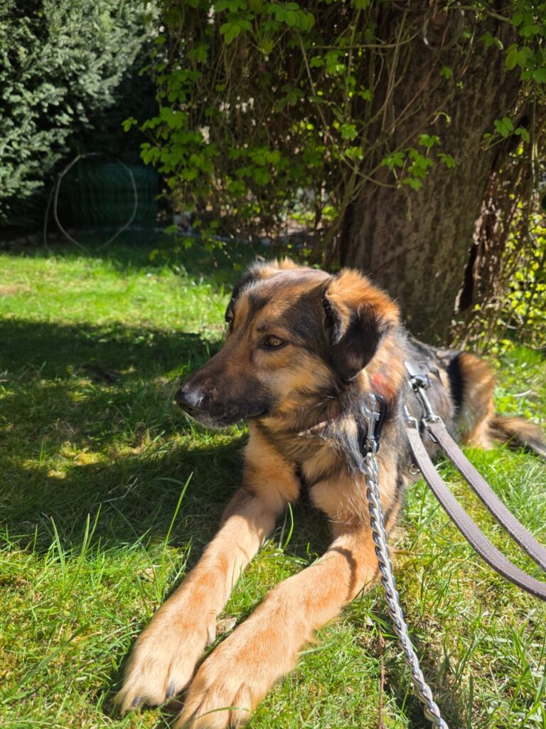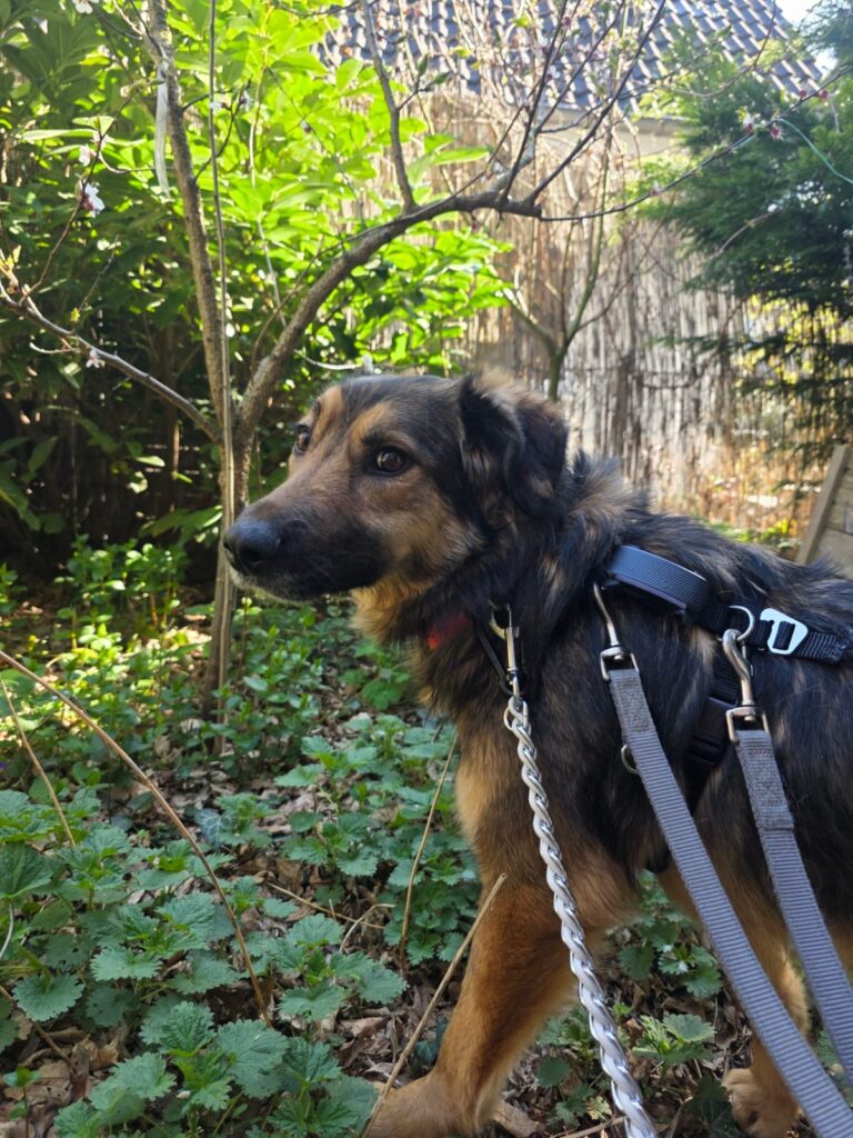 Das Laufen an der Leine klappt schon ganz gut und auch das Alleinebleiben wird bereits geübt – mit einem anderen Hund an ihrer Seite fällt ihr das deutlich leichter.